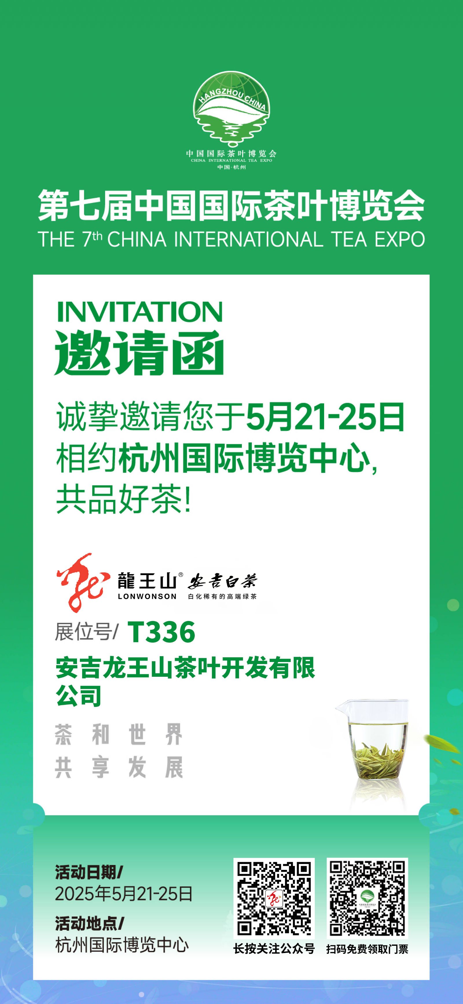 茶香氤氳西子湖,世界共飲一杯春!第七屆中國國際茶葉博覽會將于2025年5月21日-25日在杭州國際博覽中心盛大啟幕。作為全球茶行業(yè)頂級盛會,本屆展會吸引全國知名茶企、萬名專業(yè)觀眾齊聚,共探茶業(yè)新未來。龍王山安吉白茶將以“自然匠心·鮮耀世界”為主題,攜年度戰(zhàn)略新品與經(jīng)典之作榮耀入駐T336號展位。誠邀您共品安吉白茶的至鮮本味,共話茶文化的傳承與創(chuàng)新!
