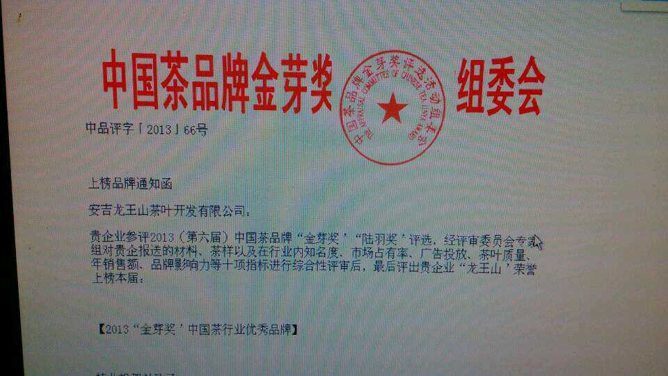 吉龍王山茶葉開發(fā)有限公司參加的2013年(第六屆)中國茶葉品牌“金芽獎”“陸羽獎”評選,經(jīng)評審委員會專家組對我公司報送的材料、茶樣以及在行業(yè)內(nèi)的知名度、市場占有率、廣告投放、茶葉質(zhì)量、年銷售額、品牌影響力等10項指標進行綜合評審后,最后評出我公司“龍王山”榮譽上榜本屆。[2013“金芽獎”中國茶葉優(yōu)秀品牌]